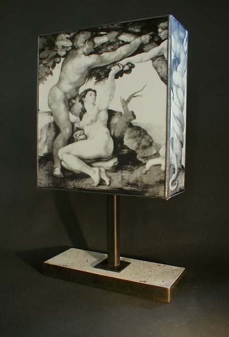 " Michelangelo lamp " Black glass enamels on ivory color glass 4" x 10" x17 1/2" back to "silkscreen lamp #2" main page About us - Jewelry box - Picture frame - Bowls / plates - Sculptural Lamps - Clocks - pendants - Links Contact us